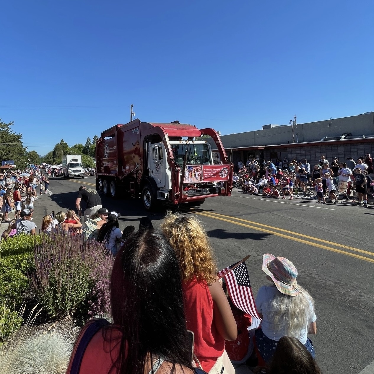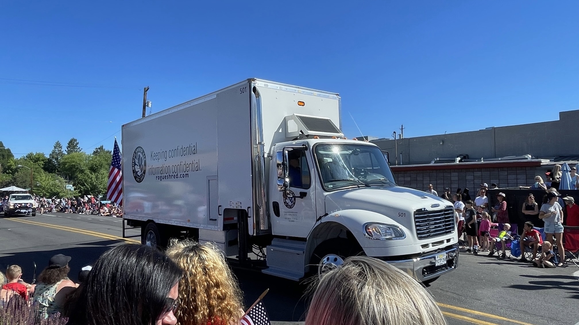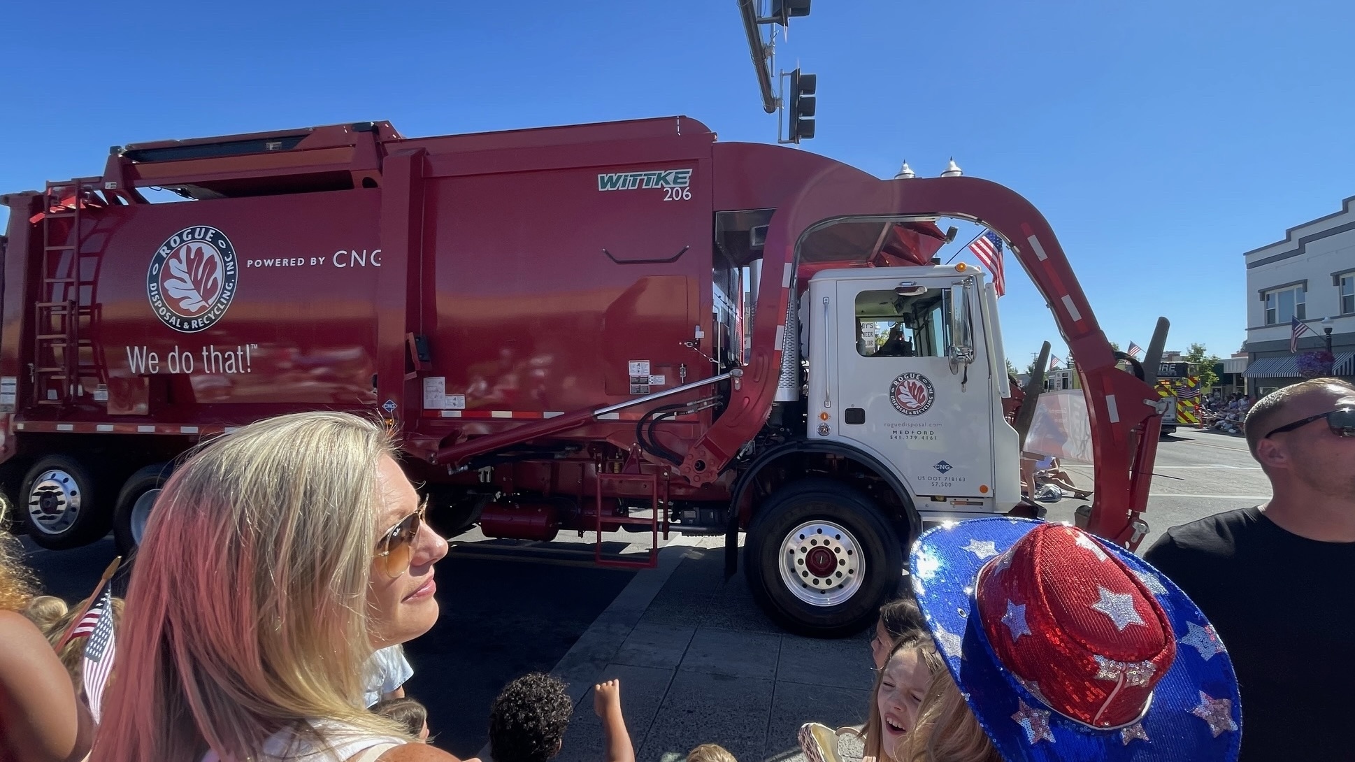 The red, white and blue were out in full force during the city of Central Point’s annual July 4th parade. A highlight of this year’s Freedom Festival, the 90-minute parade wound its way through the center of town, with thousands of patriotic area residents lining the streets. Rogue’s entry included two different trucks — a front loader, driven by Jamie Montague, and a Rogue Shred truck, piloted by Dave Warden and Alex Perez.