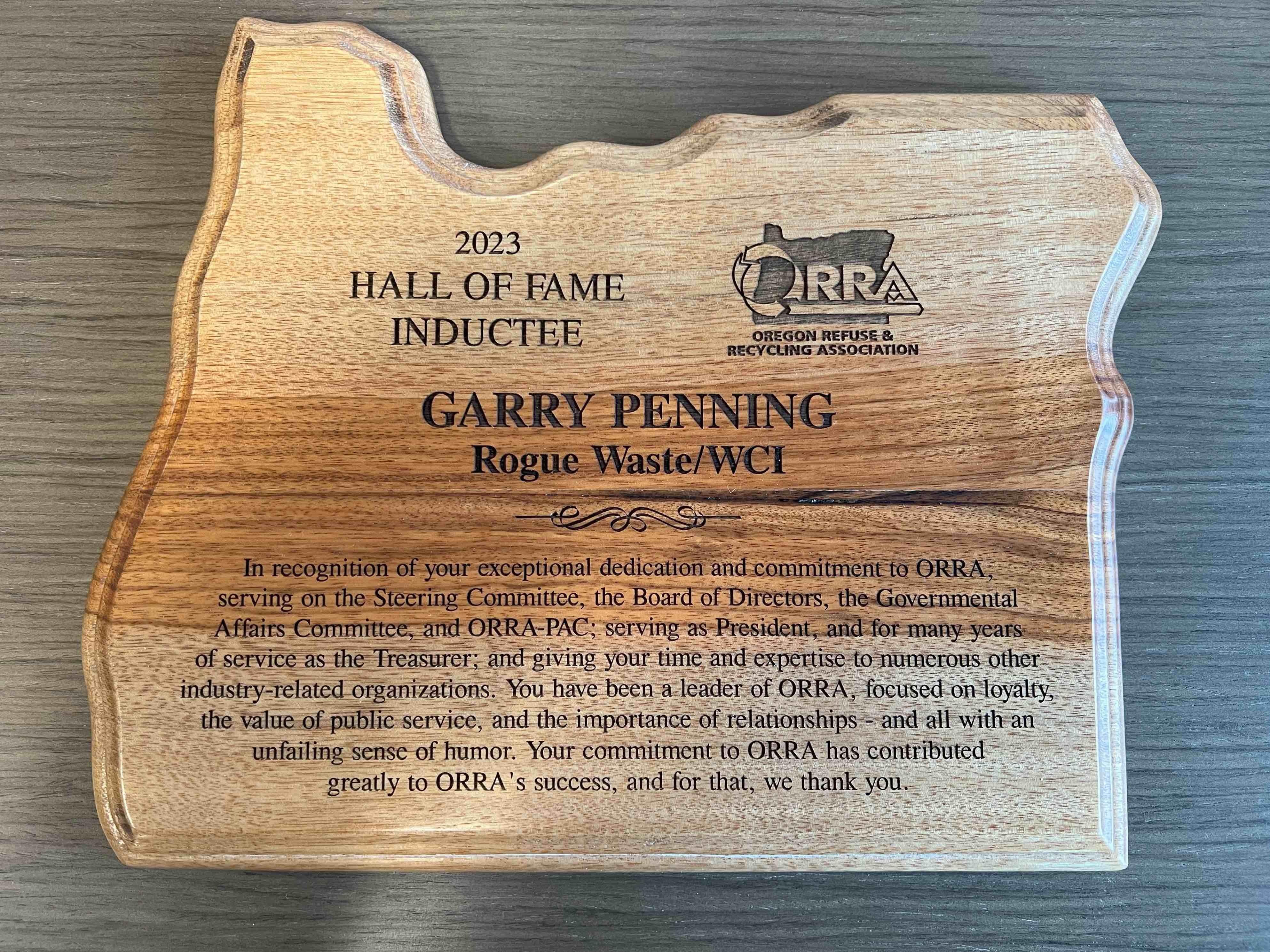 As a company and as a community, we are fortunate to have Garry Penning doing the important work he does so well. He’s a true industry heavy-hitter and it’s an honor to be able to celebrate his many accomplishments with ORRA, as well as his time with us at Rogue Waste, Inc. Congratulations and thank you for all you do, Garry. And even though you’re now an official Hall of Famer, you still need to show up for your day job!