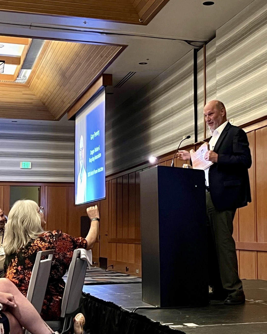So how does one get inducted into the ORRA Hall of Fame? Simply put, it’s a big deal – and an even bigger honor. According to Kristan Mitchell, the three past ORRA presidents have the privilege of deciding whether to induct honorees into their Hall of Fame. The inductees, if any, are then announced at each year’s Fall Convention banquet. At this year’s ceremony, both Stephen Gambee (former CEO of Rogue Waste, Inc.) and Ron Middelstaedt, CEO of Waste Connections, were in attendance.
